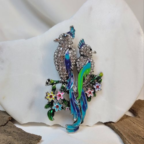 Premium seri mavi yeşil mineli sakura çiçekli sultan papağan ailesi broş