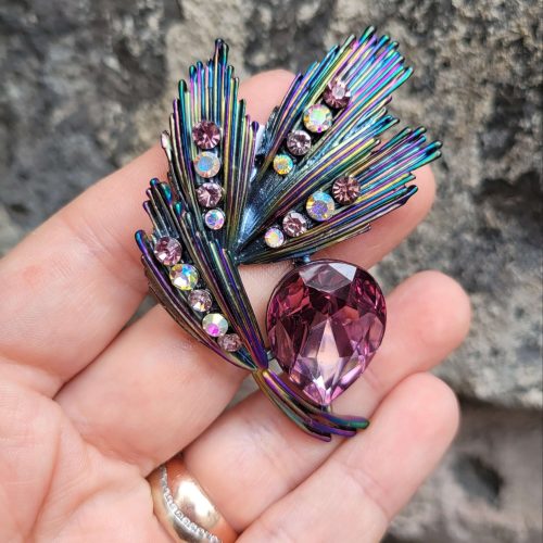 80ler vintage model – Janjan Yapraklı Mor kristal çiçekli broş ve kolye ucu (tek ürün)