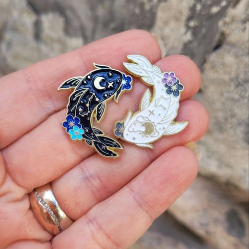 Ejderhaya dönüşen siyah ve beyaz çift koi balıkları rozet