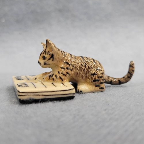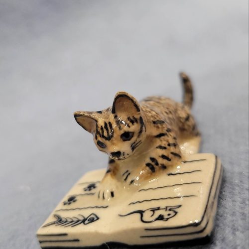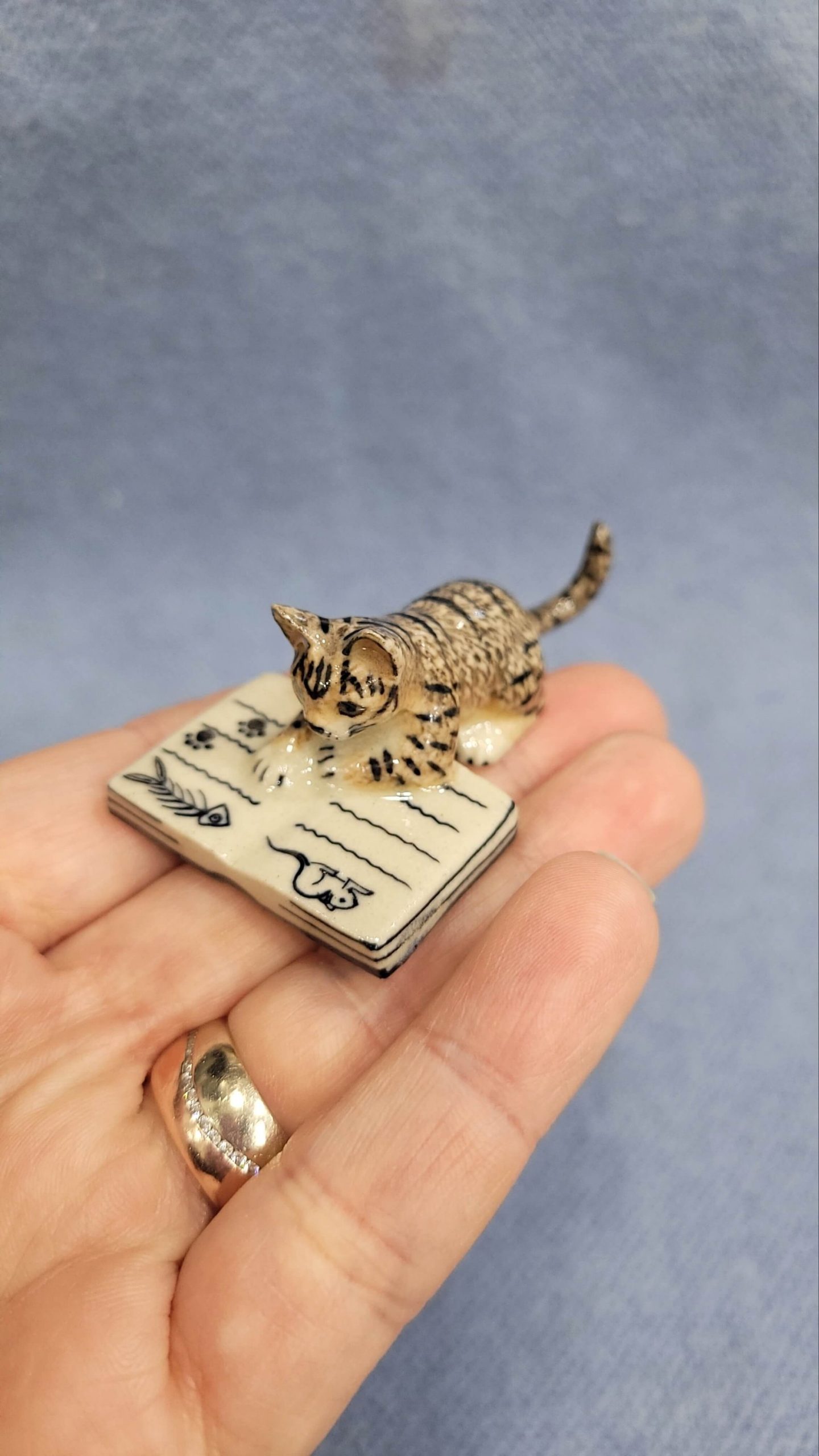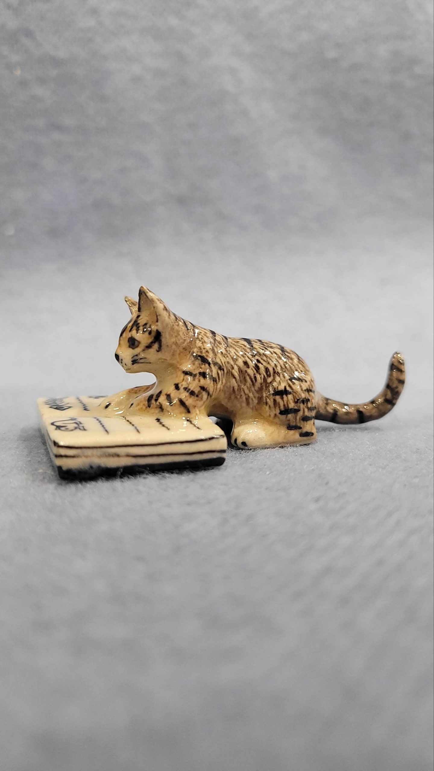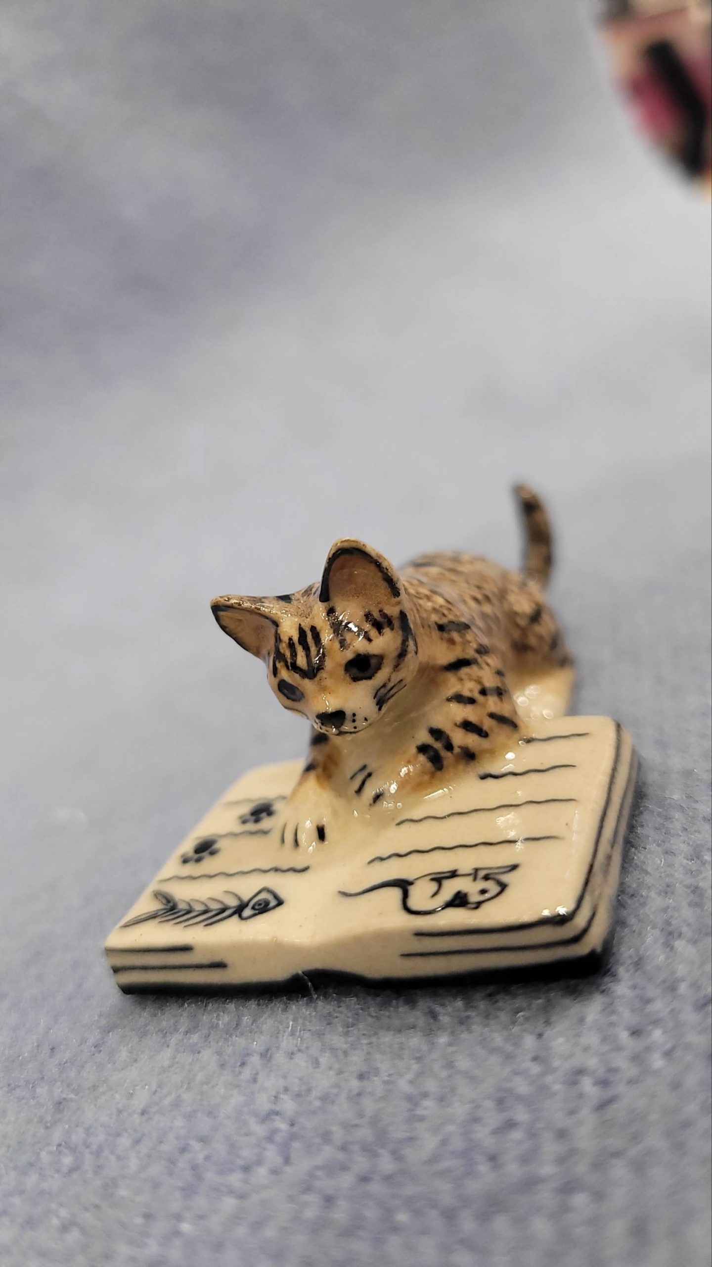 El yapımı ve el boyaması italyan porselen kitapsever tekir kedi minyatür
