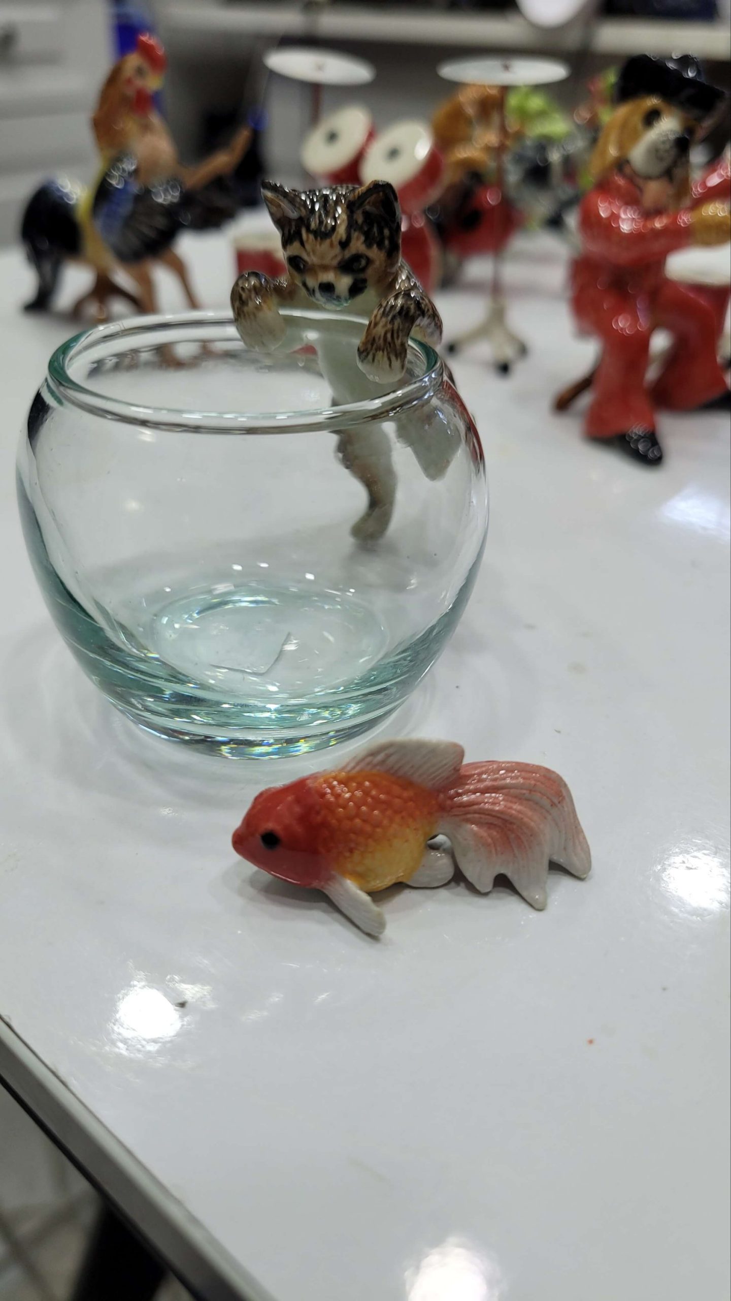El yapımı ve el boyaması italyan porselen sarman kedi ve japon balık el yapımı cam fanus minyatür