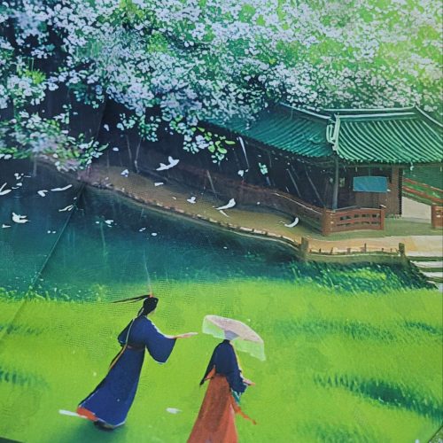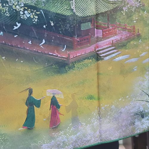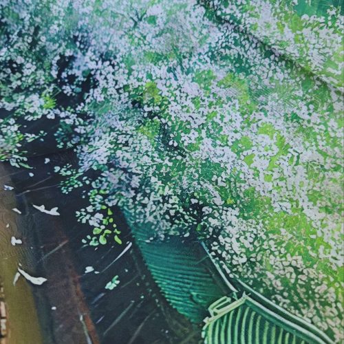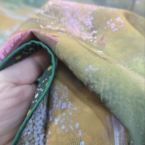 Japon sakura aşk mabedi- Yeşil sarı sakura çiçek bahçesi ipeksi saten jakarlı çift yönlü şal