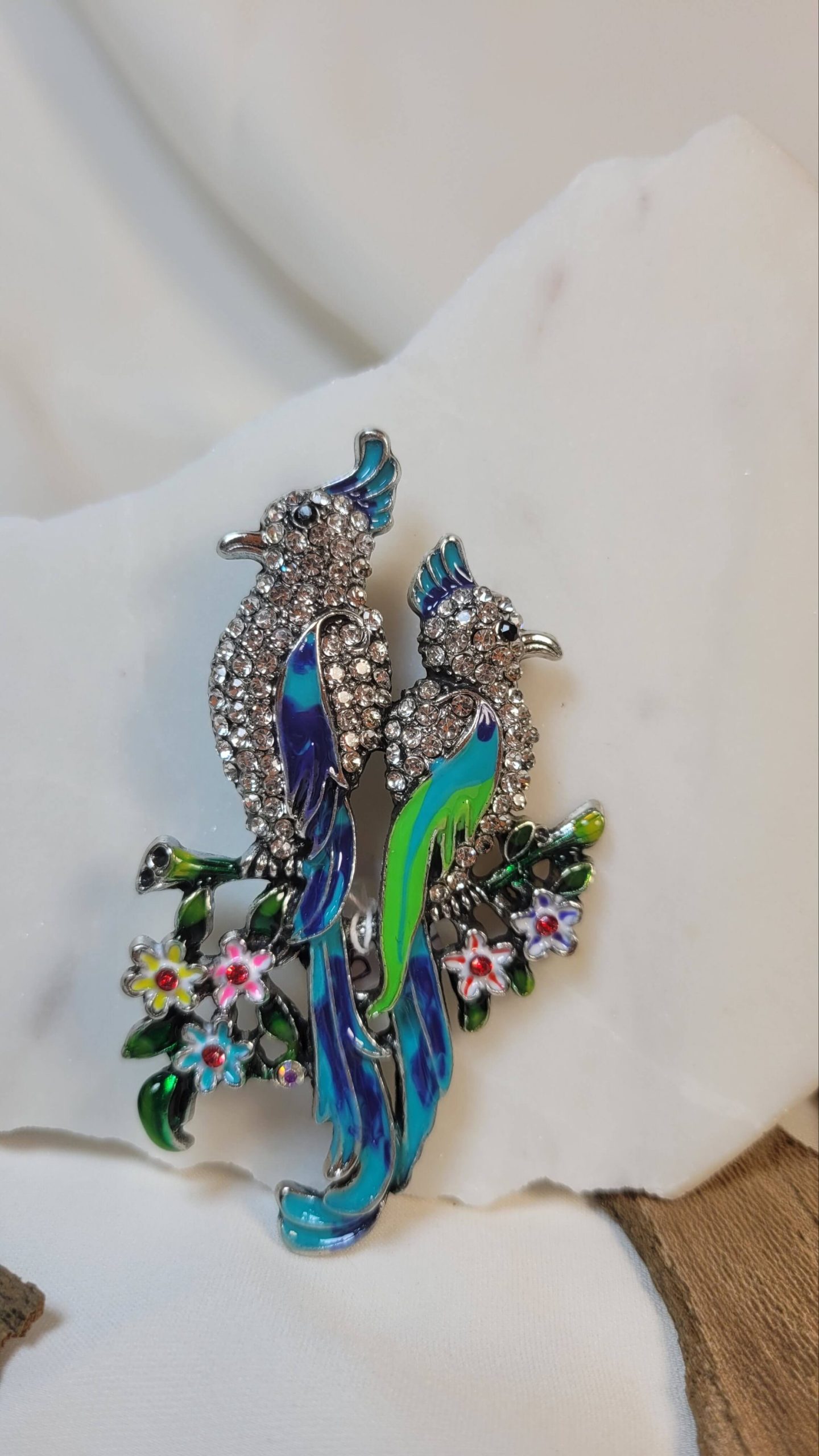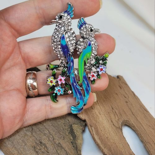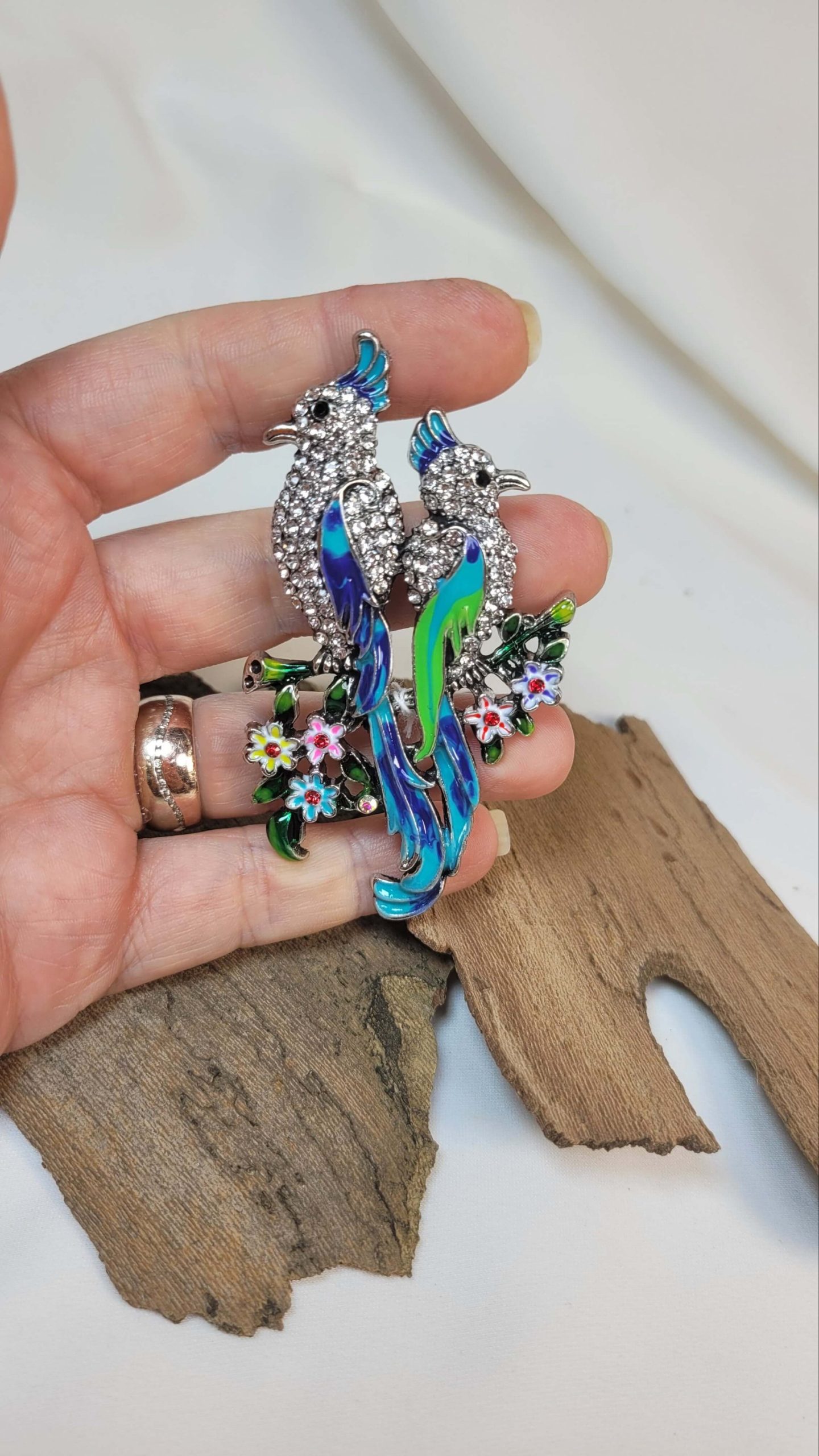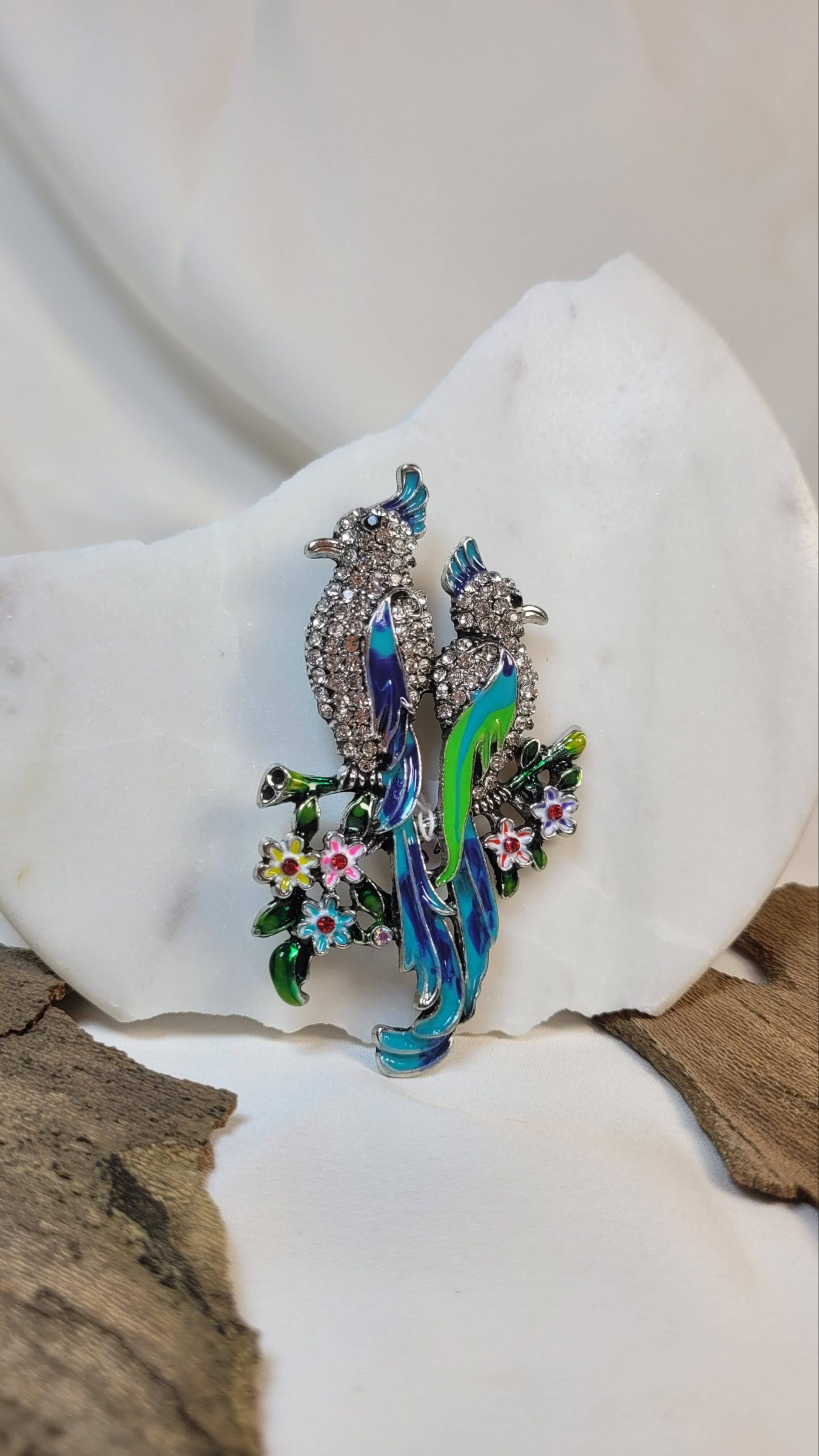 Premium seri mavi yeşil mineli sakura çiçekli sultan papağan ailesi broş