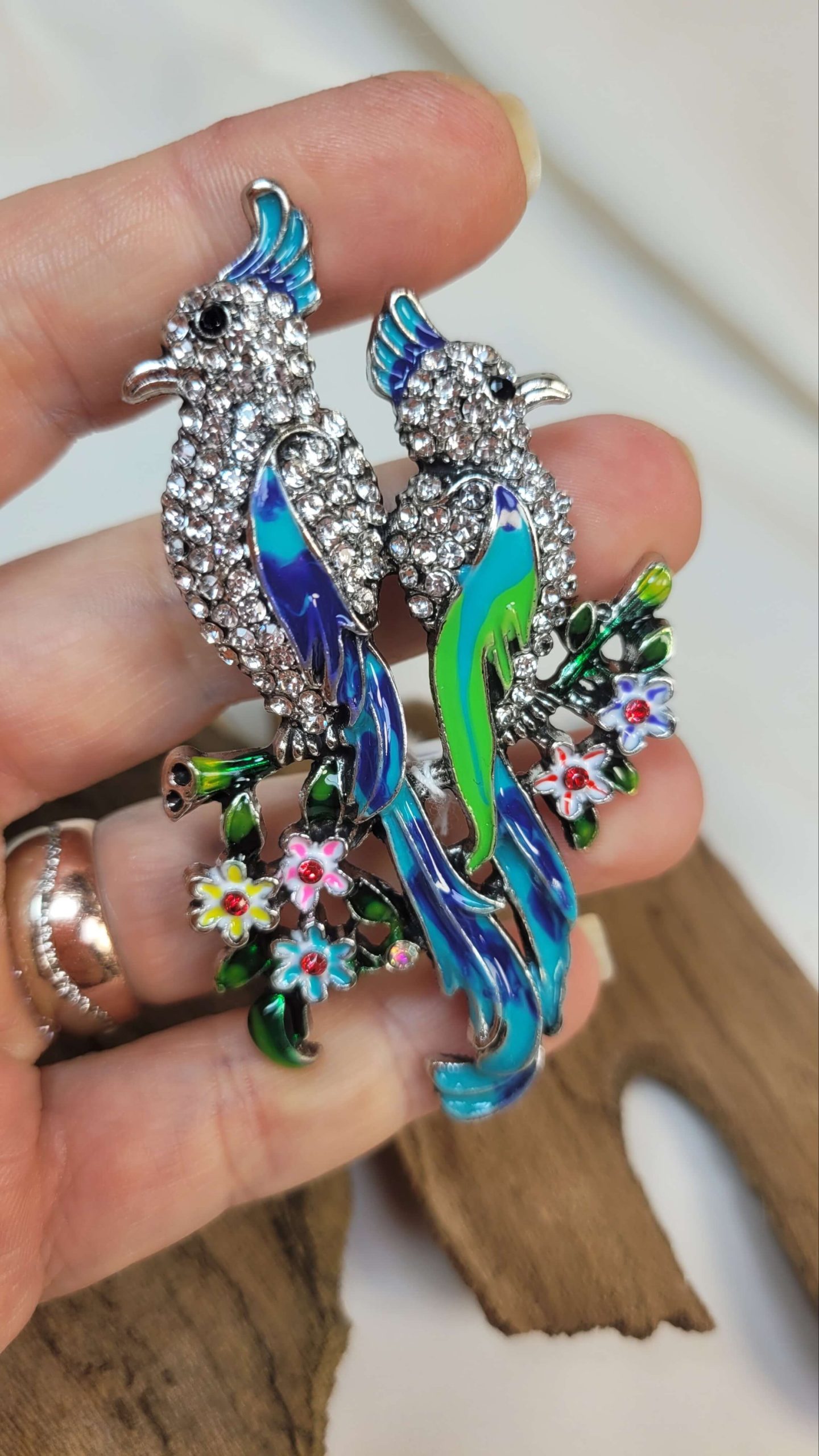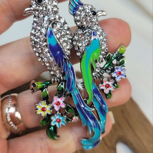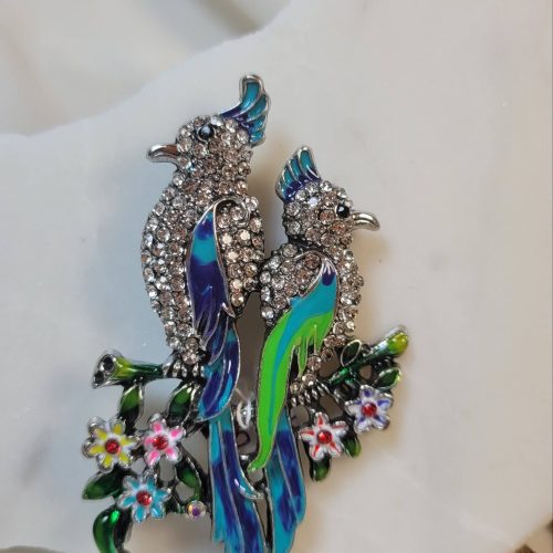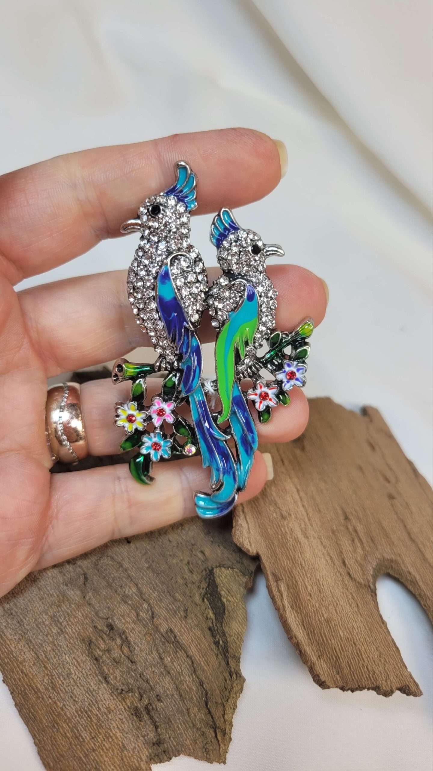 Premium seri mavi yeşil mineli sakura çiçekli sultan papağan ailesi broş