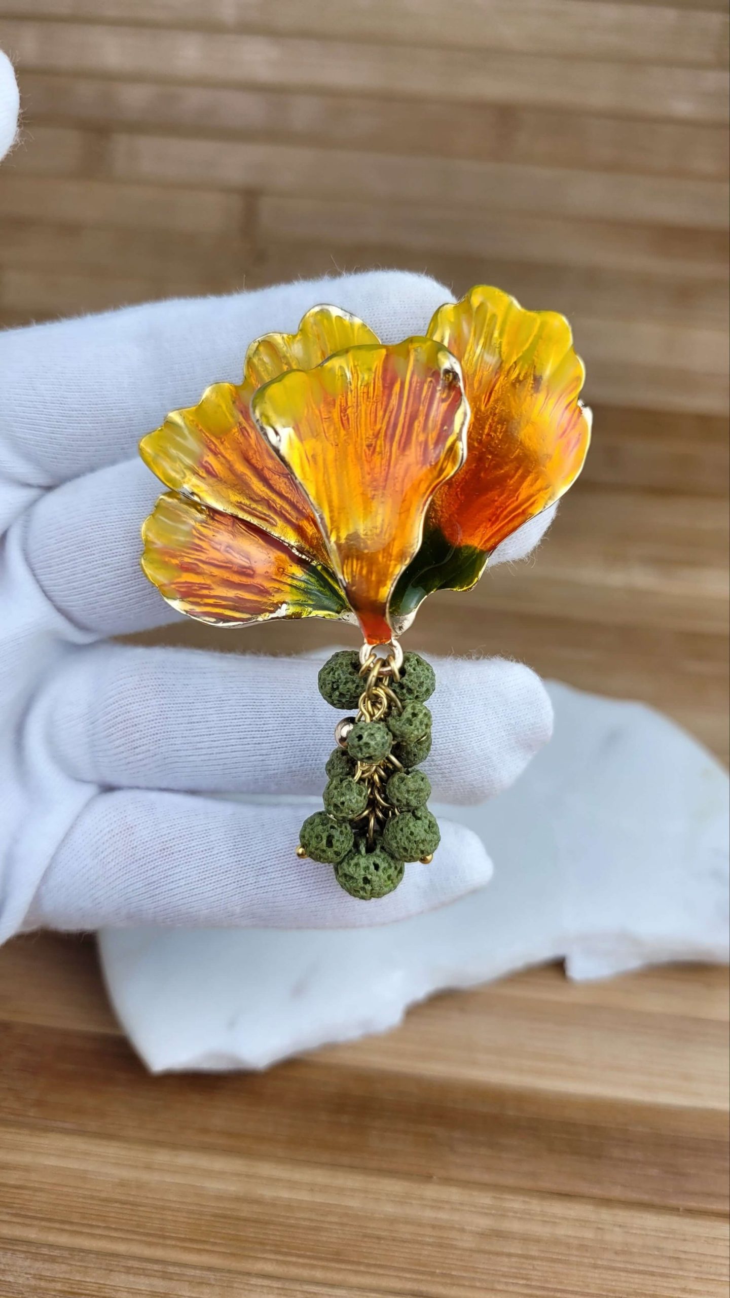 Lav taşlı salkım turuncu sarı yeşil mineli hayat ağacı ginkgo yapragı broş