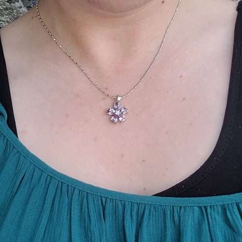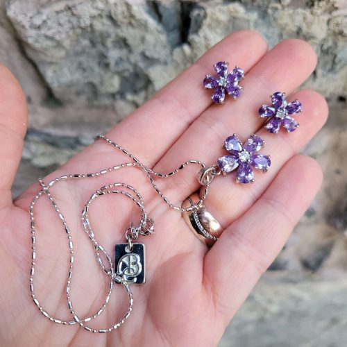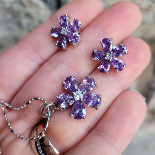 Lila zirkon taşlı mıhlama işçilikli kolye zincir küpe takım