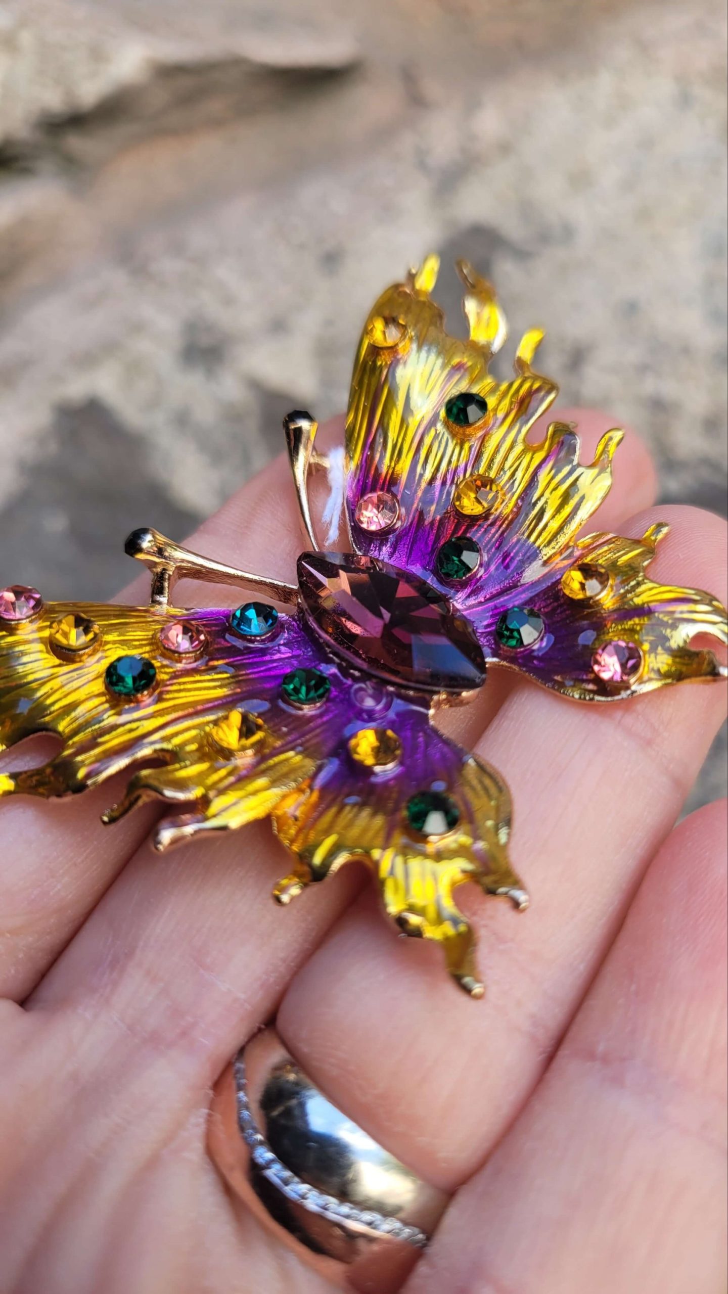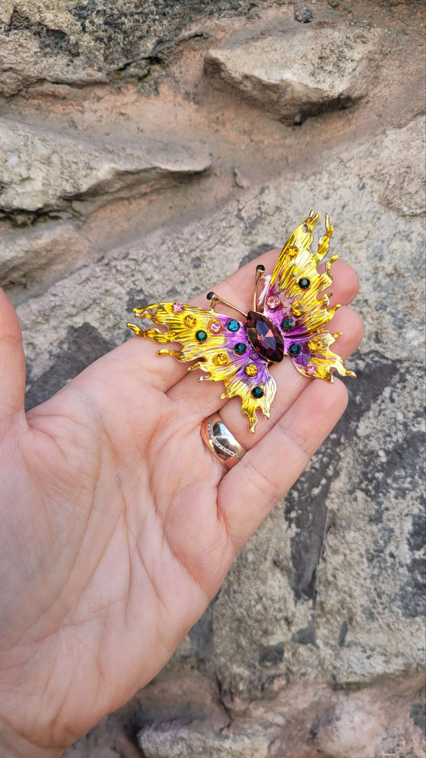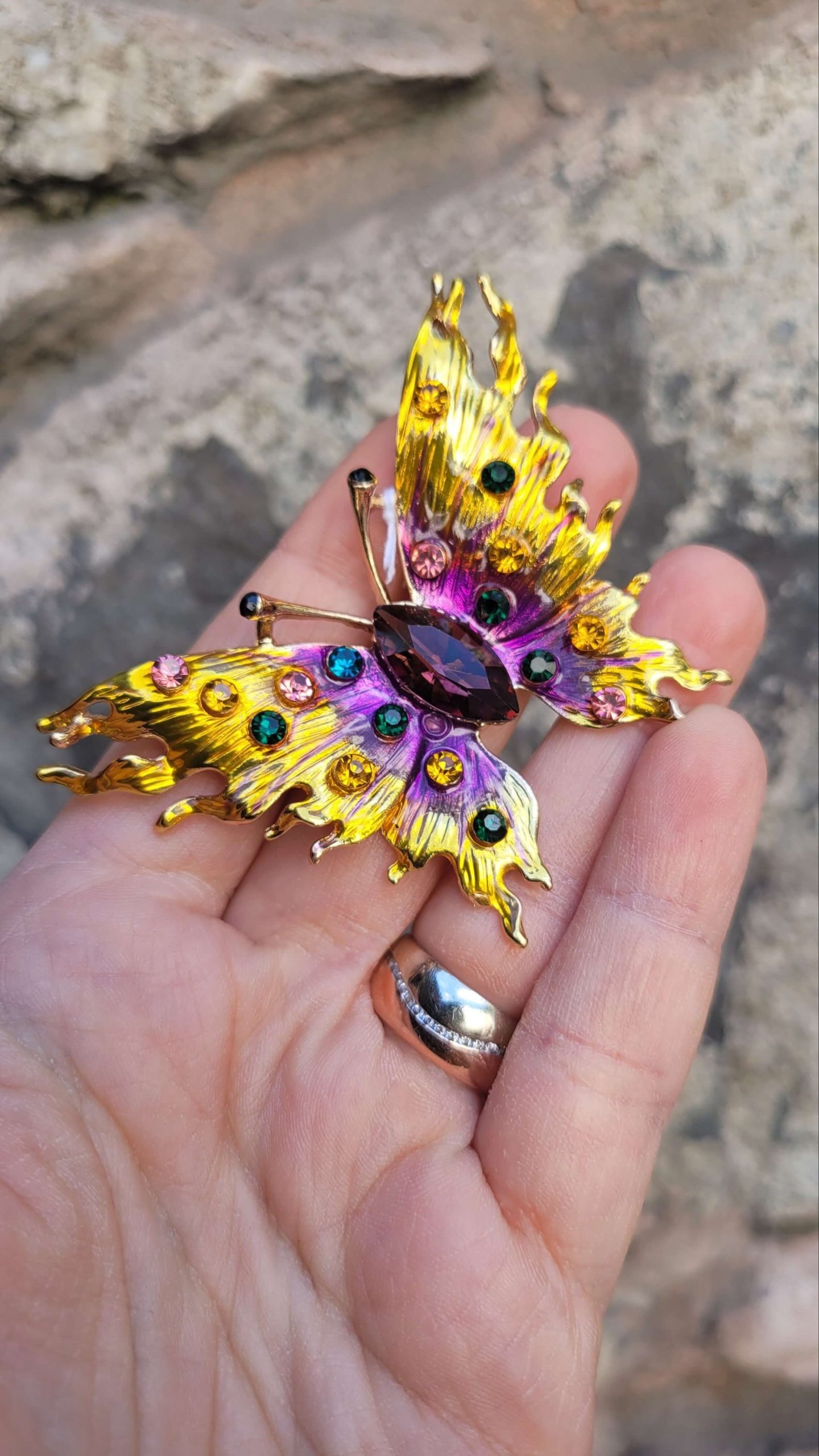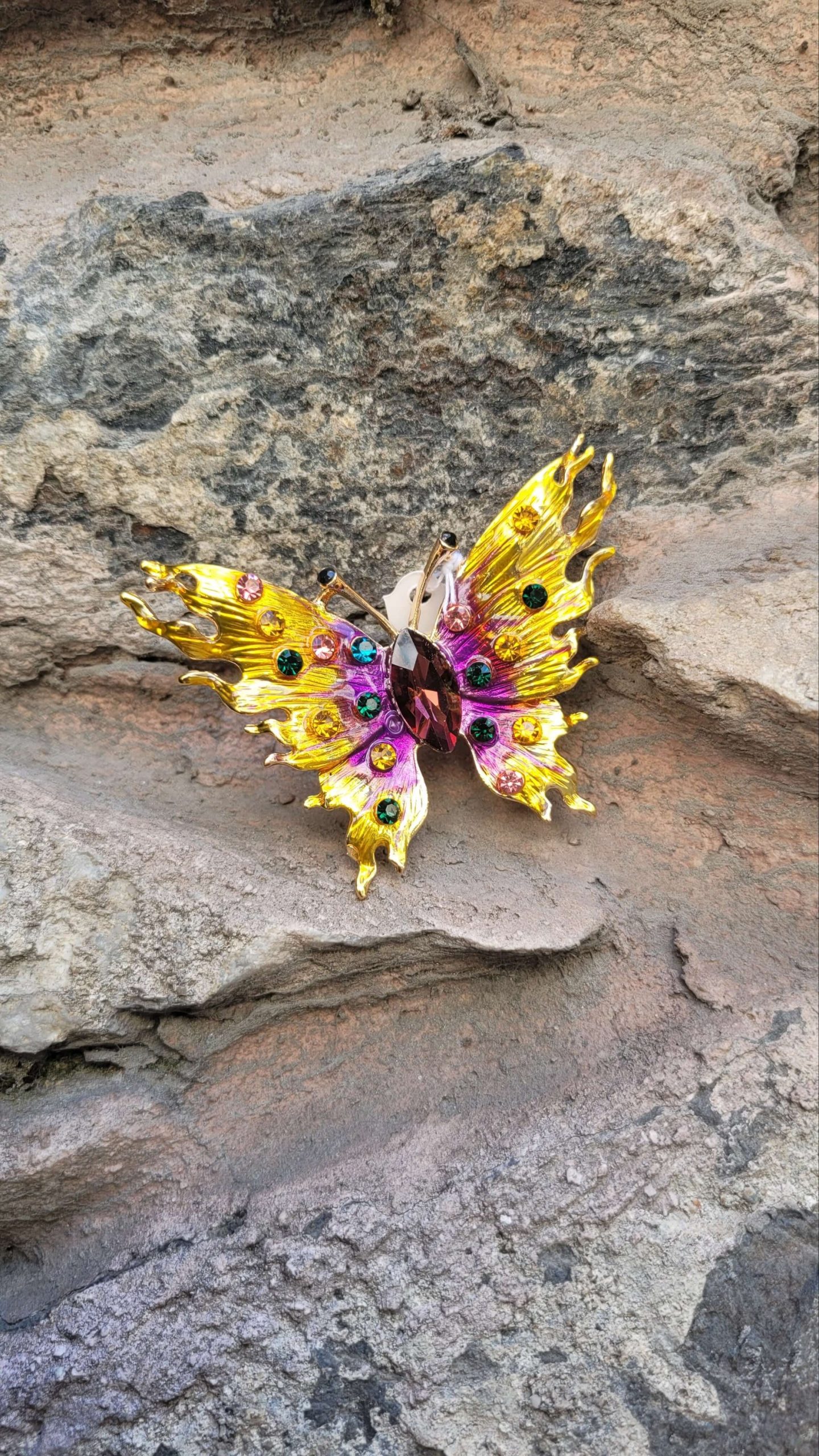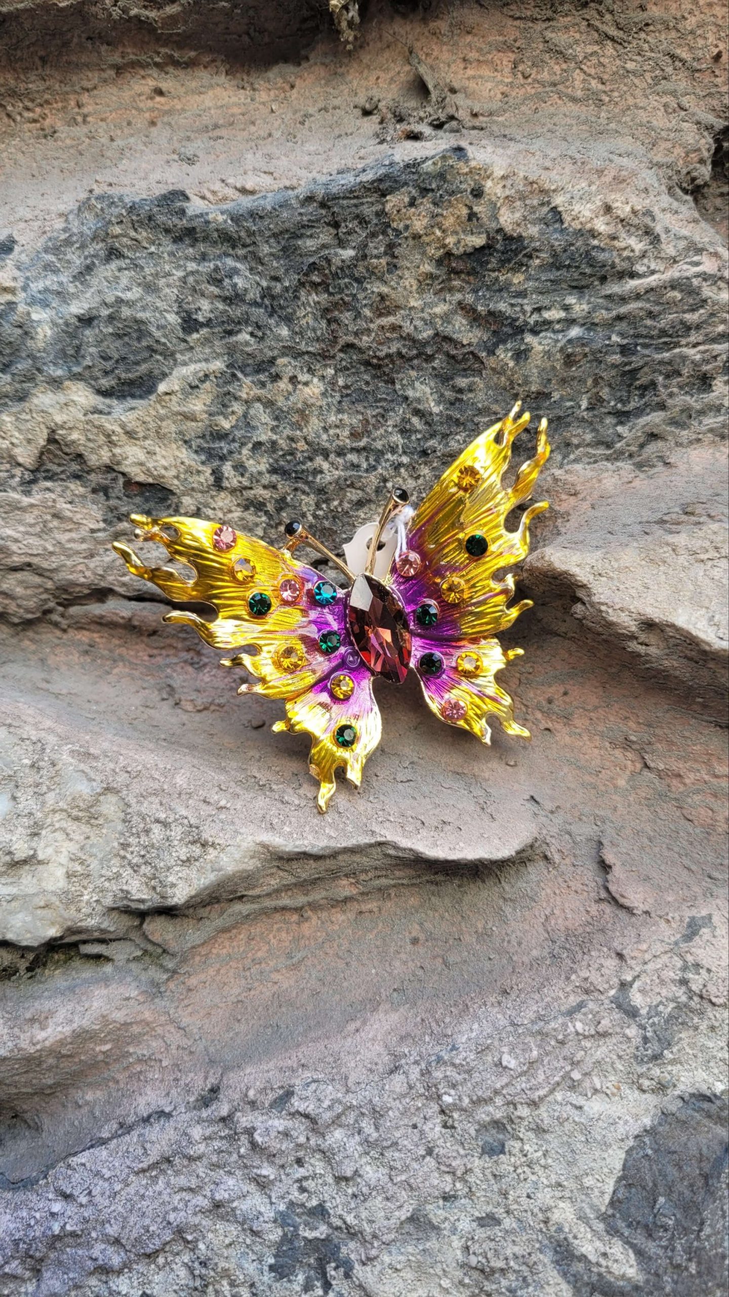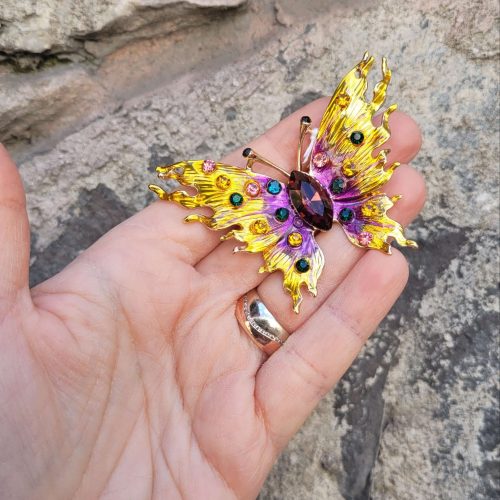Peri tozu serpilmiş mor lila sarı mavi kristal taşlı altın kelebek broş