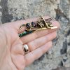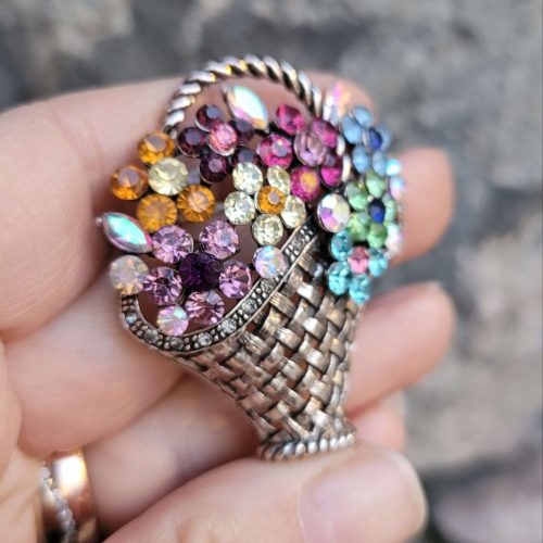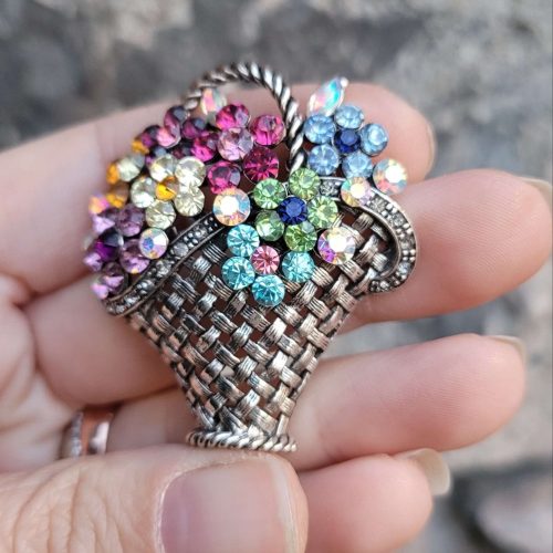 Renkli kır çiçekli örgü sepetli gümüş renkli sepet broş