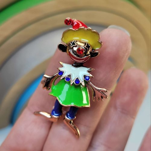 Sarı saçlı kırmızı şapkalı yeşil elbiseli palyaço broş