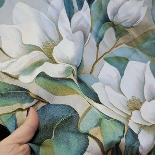 Mavi yeşil beyaz manolyalar desenli ipeksi saten şal