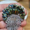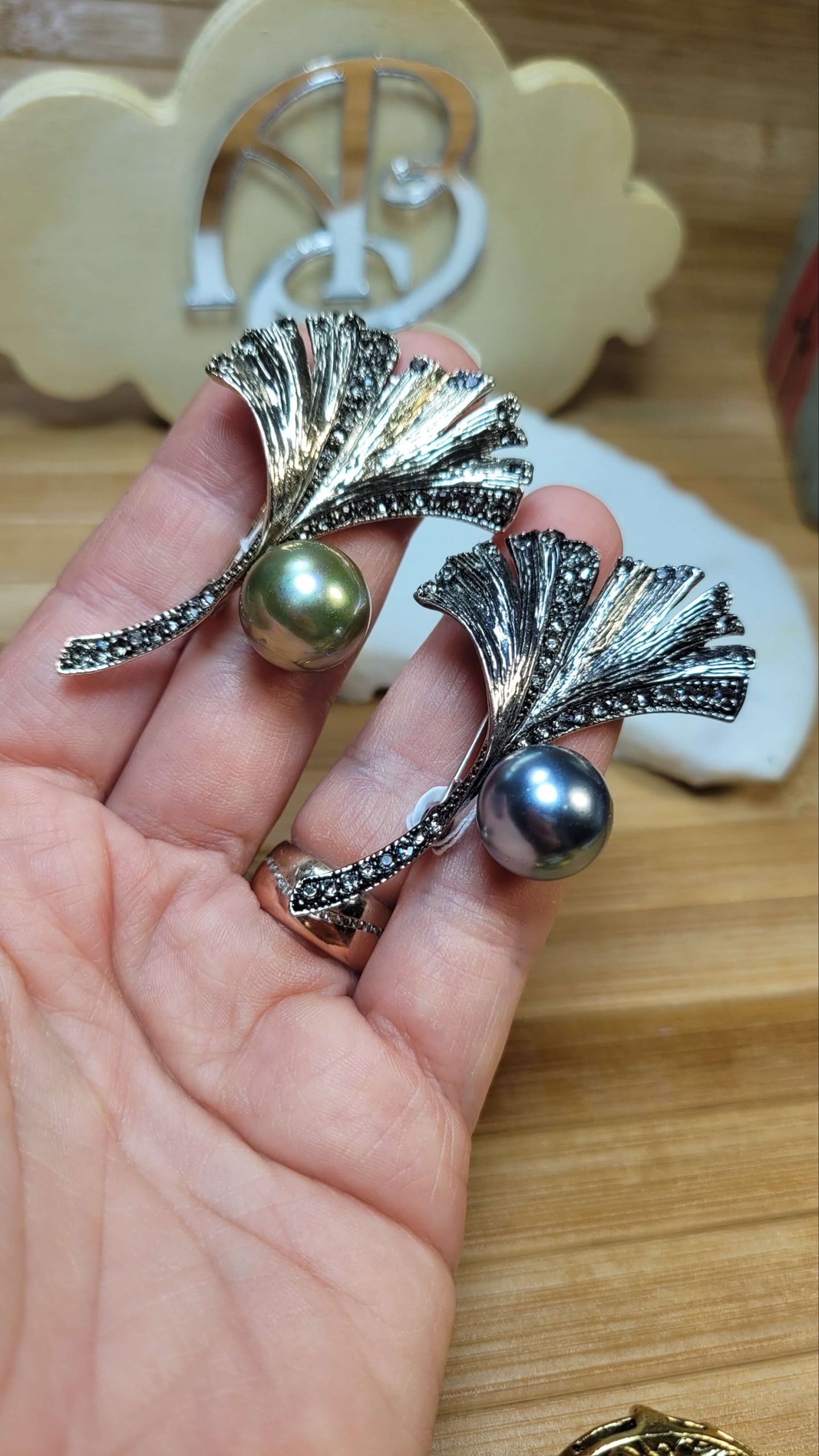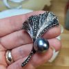 Siyah kristal taşlı yeşil incili sarı renkli vintage ginkgo yaprağı broş