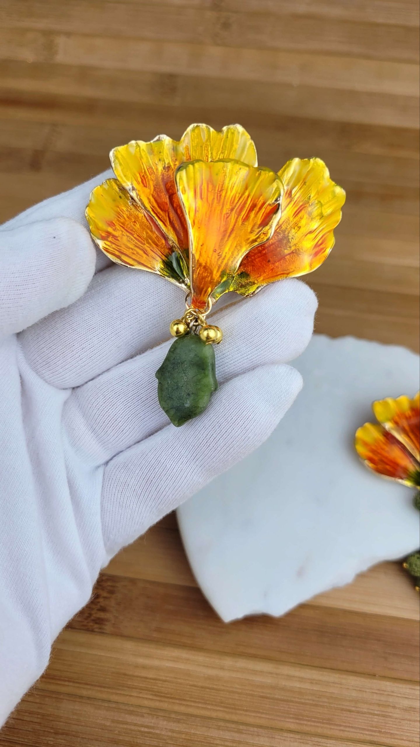 Yeşim taşlı turuncu sarı yeşil mineli hayat ağacı ginkgo yapragı broş